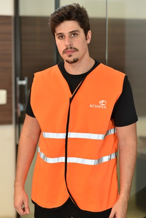 Modelo aberto através de velcro, sem manga, sem bolso, faixa refletiva 3M 2,5cm na altura da cintura em duas alturas, acabamento em viés na cor preto no fechamento, na barra e na cava das mangas, estampa em silk screen peito esquerdo e costas.